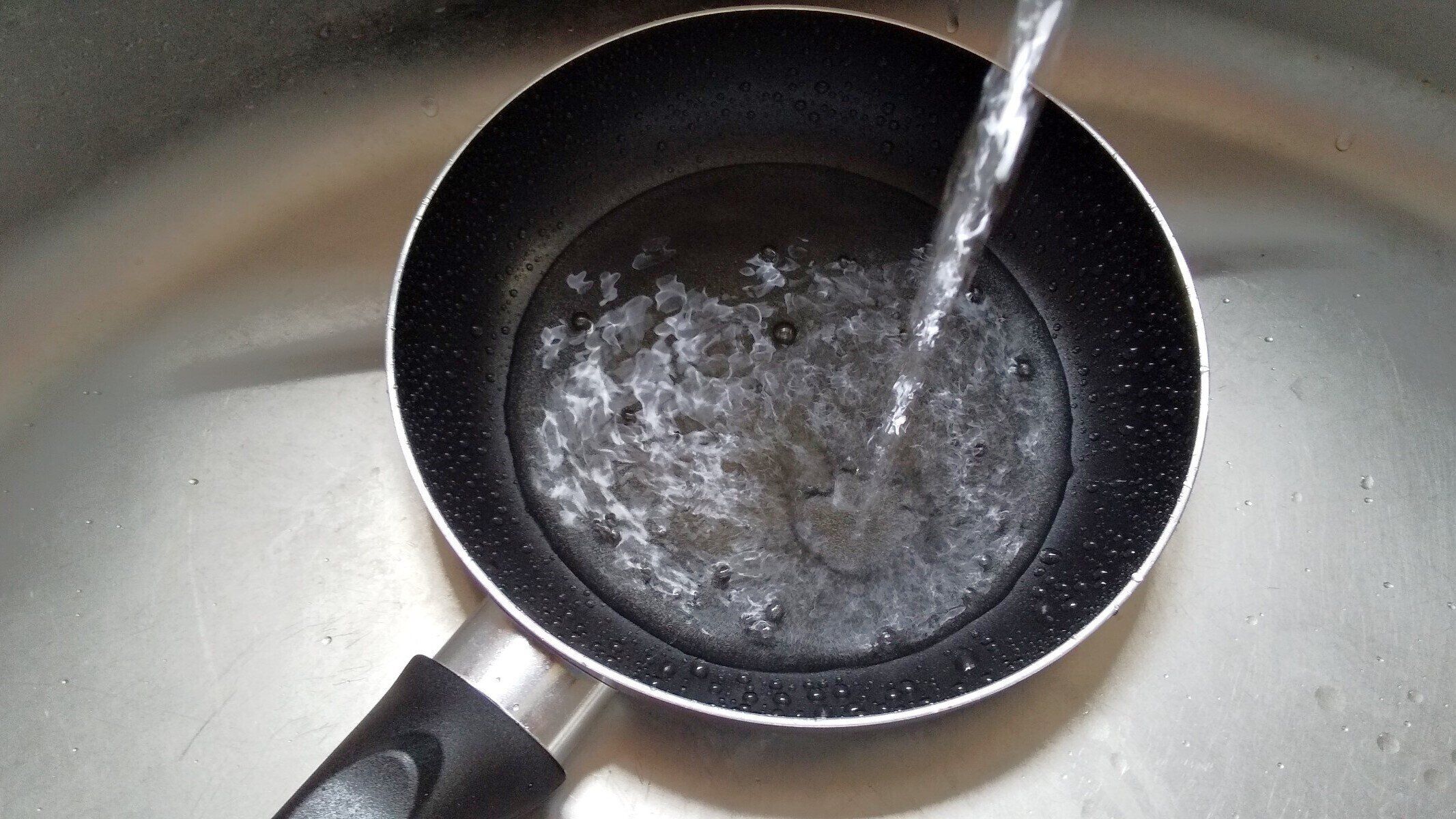 調理後のフライパンが熱いうちに、水道の水を注いで汚れを落ちやすくしようという行為。