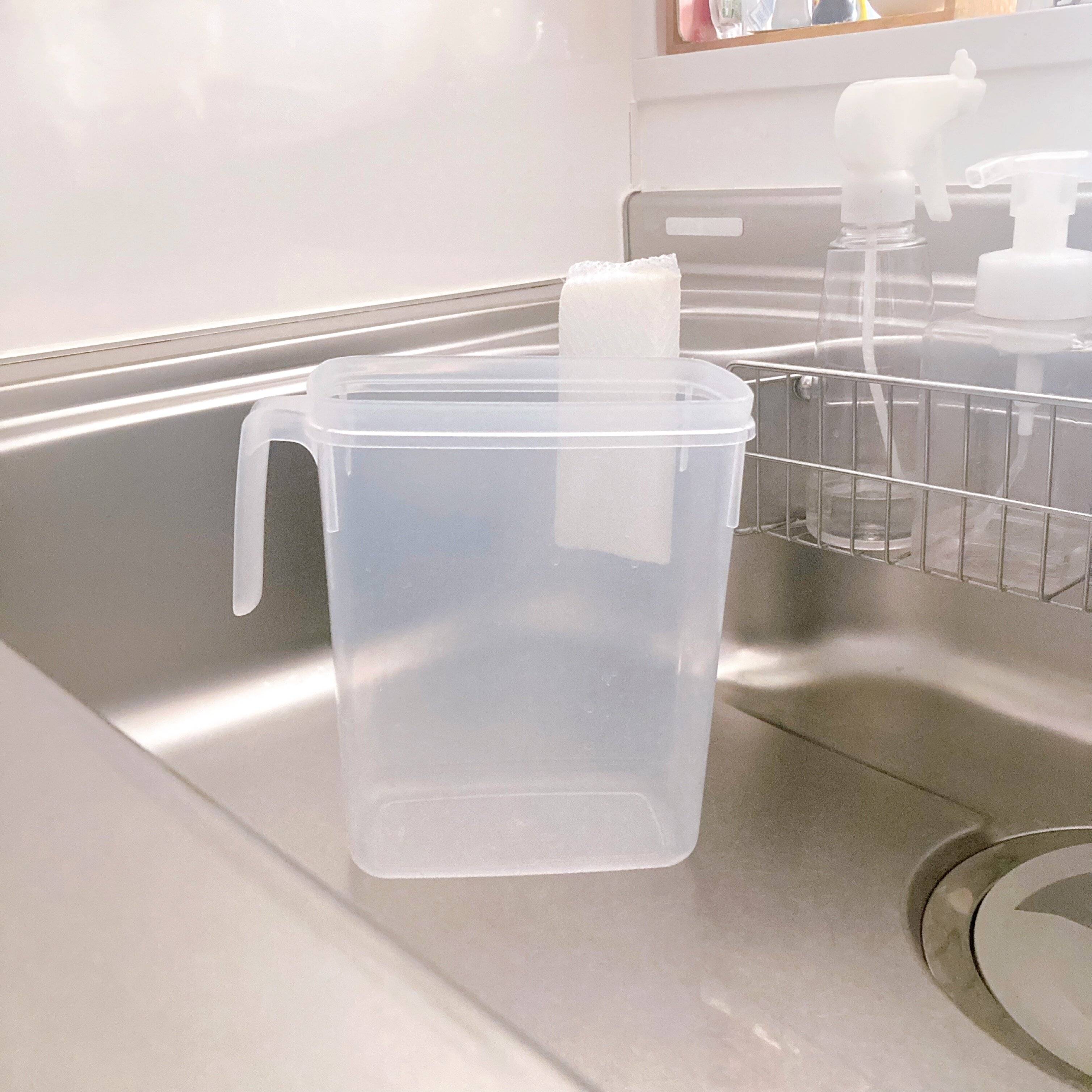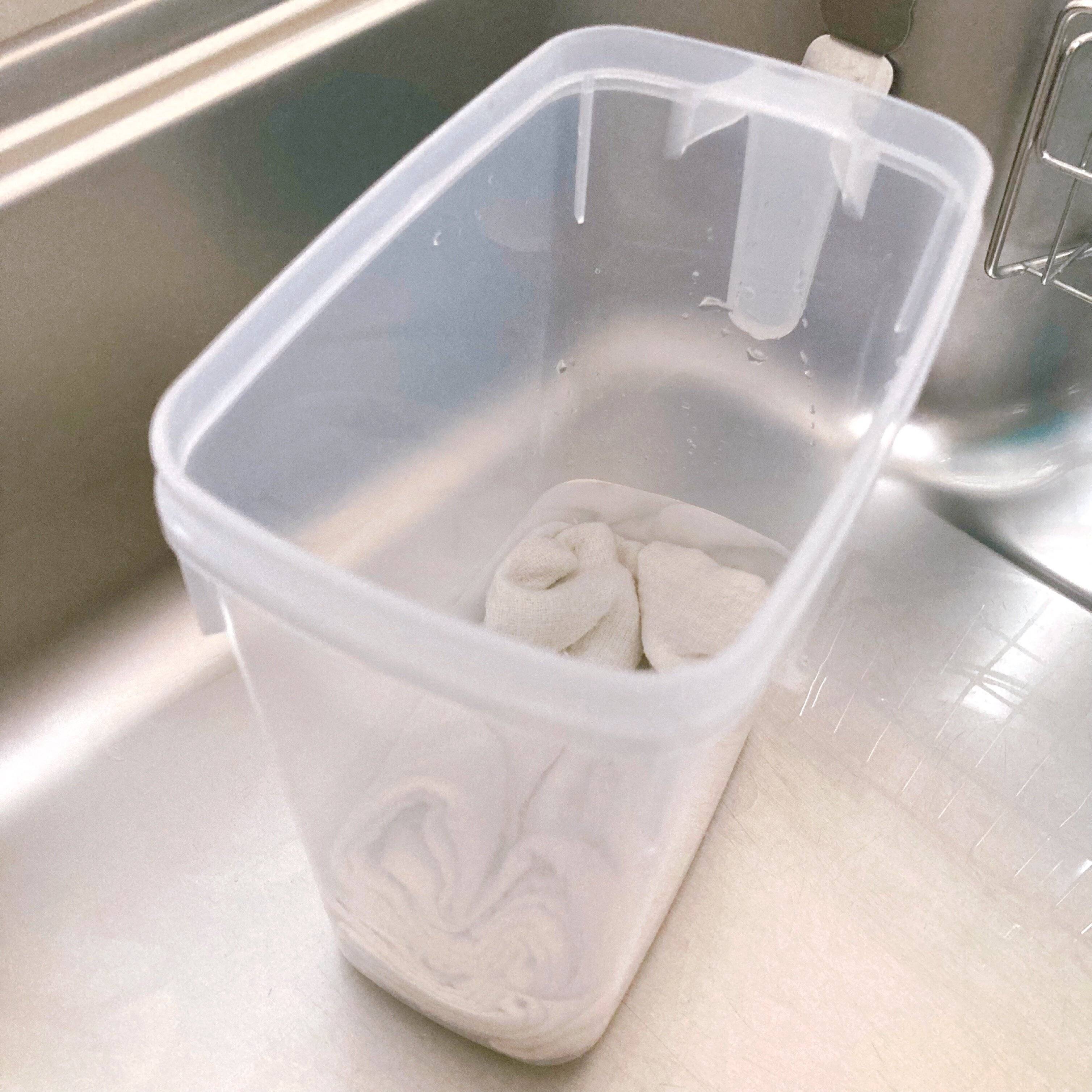 冷水筒に入る大きさに折りたたんで漂白剤を溶かした水に浸けておくだけですが、これまでと同様に水の量は少なくてすむのとシンク内に置いていても邪魔にならないのが気に入っています。