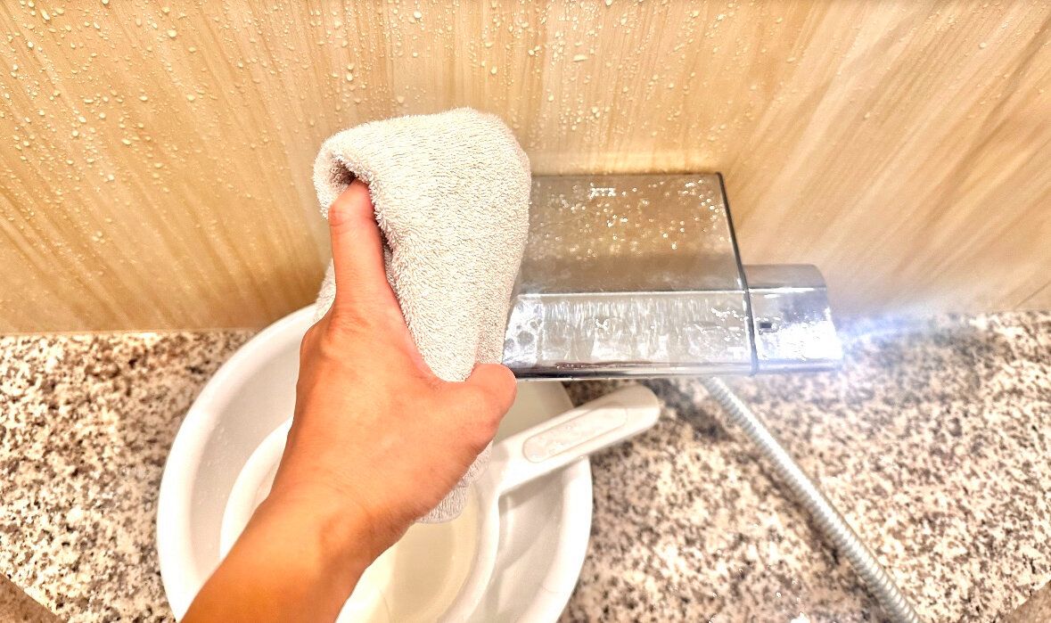 お風呂から上がる前にスクイジーで水を切り、セリアのバスタオルでさっと拭き上げることでキレイが続きます。
