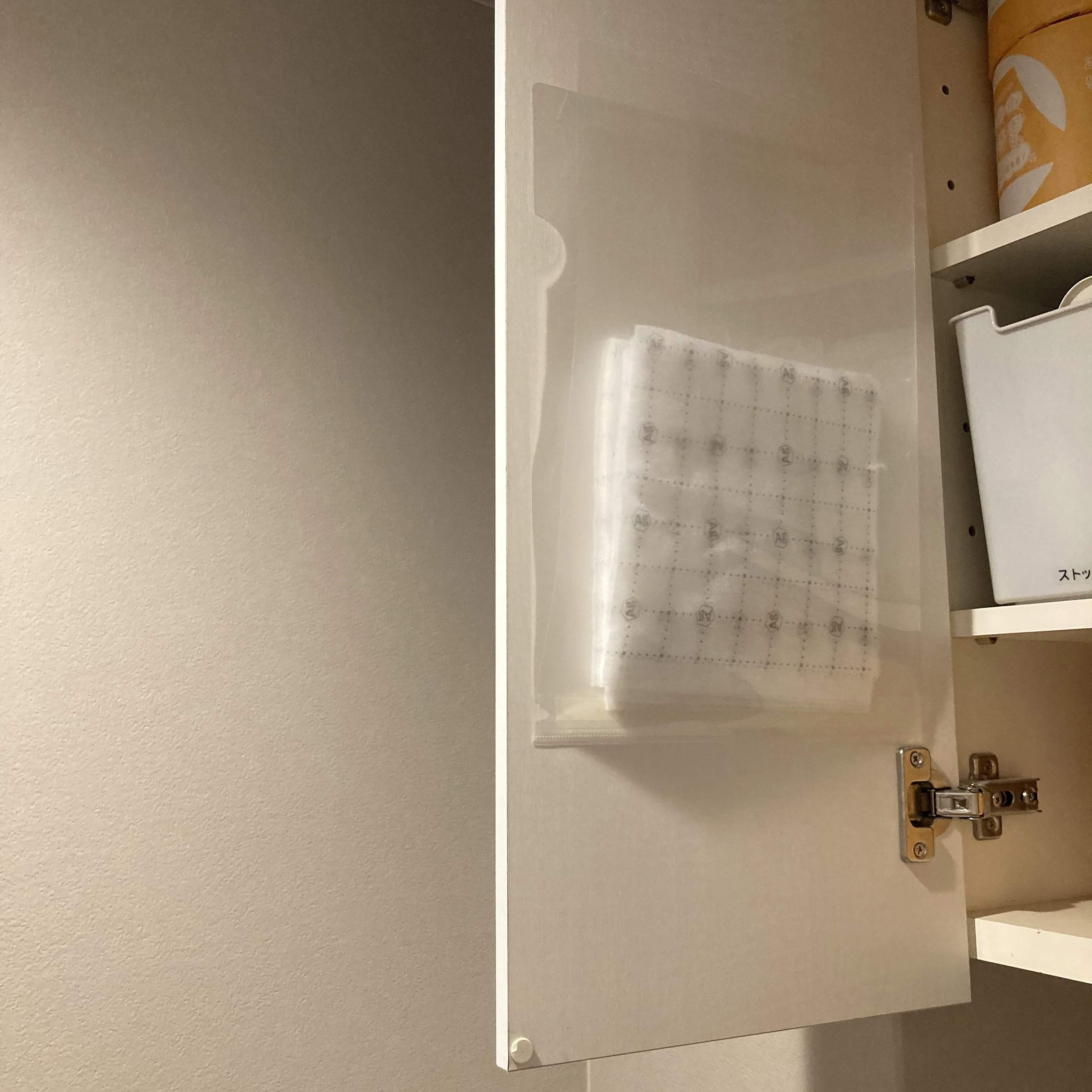 わが家は脱衣所にあまりスペースがないので、トイレの収納扉裏面に貼っています。位置を決めるときに、手をのばして取りやすいか、高さもちょうど良いかなどをしっかりイメージすると良いですよ。