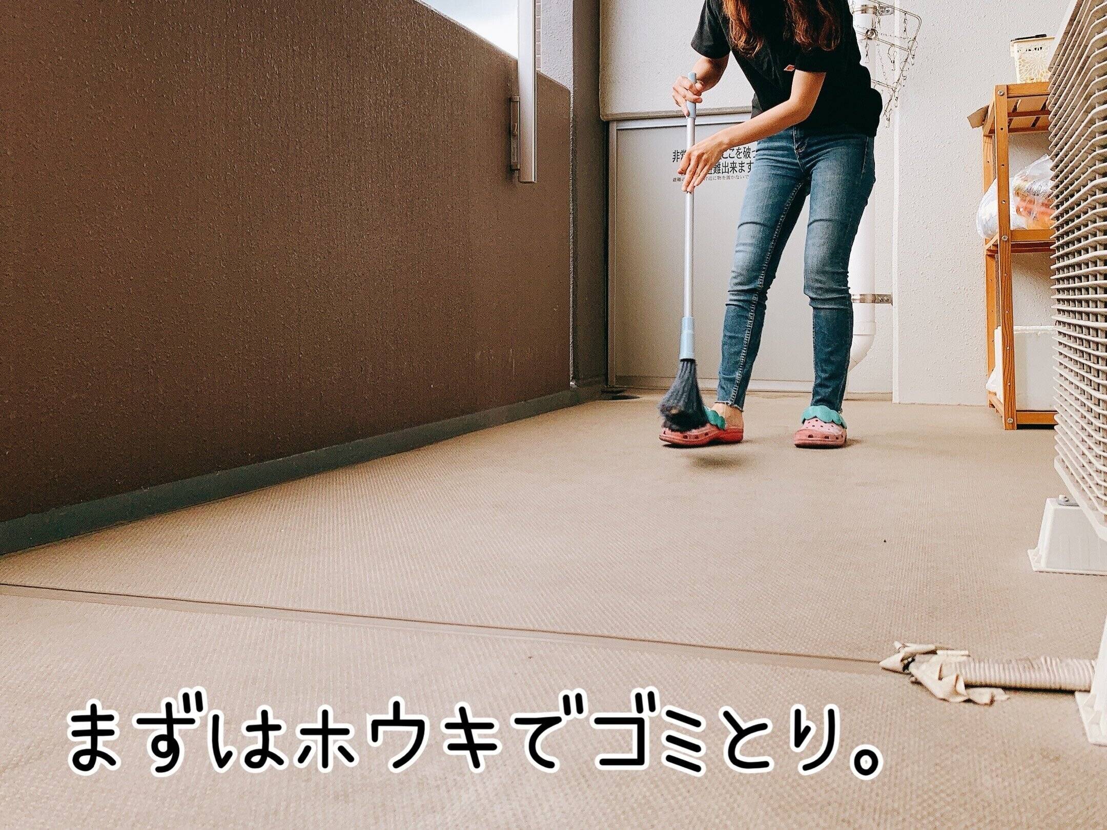 バルコニーには外から入ってきた砂埃や塵、そして、干した洗濯物から落ちてくる髪の毛やほこりなど目に見えにくいゴミがたくさんです。そのごみをまずはホウキで掃き、しっかりと取り除くことで、そのあとの掃除がスムーズに行えます。