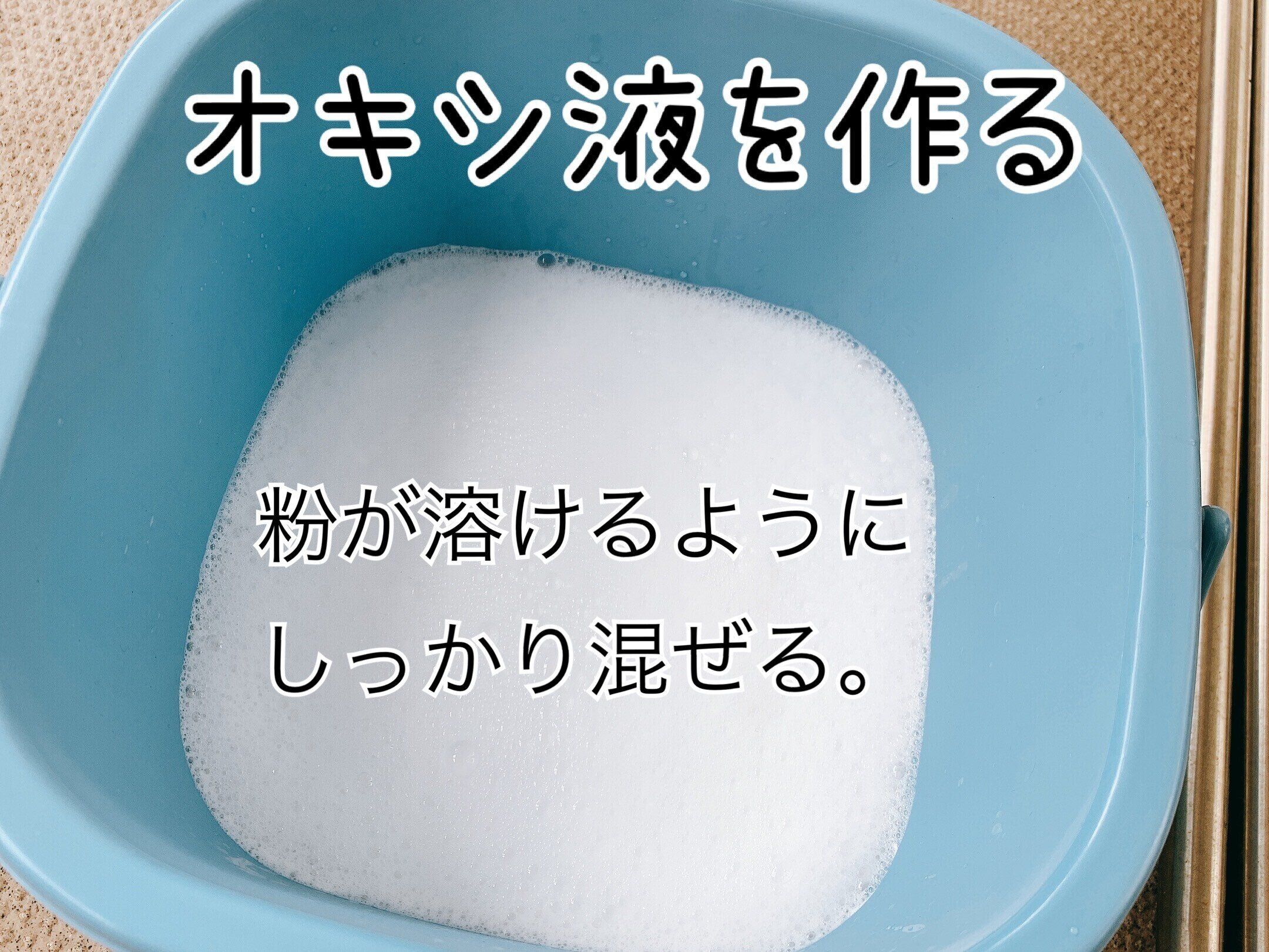 オキシクリーンを使って、オキシ液を作ります。水でなく40℃~60℃のお湯を準備してください。オキシクリーンをしっかり溶かし、洗剤の効力を発揮させるためにはお湯が必要となります。私はいつも60℃のお湯を使います。