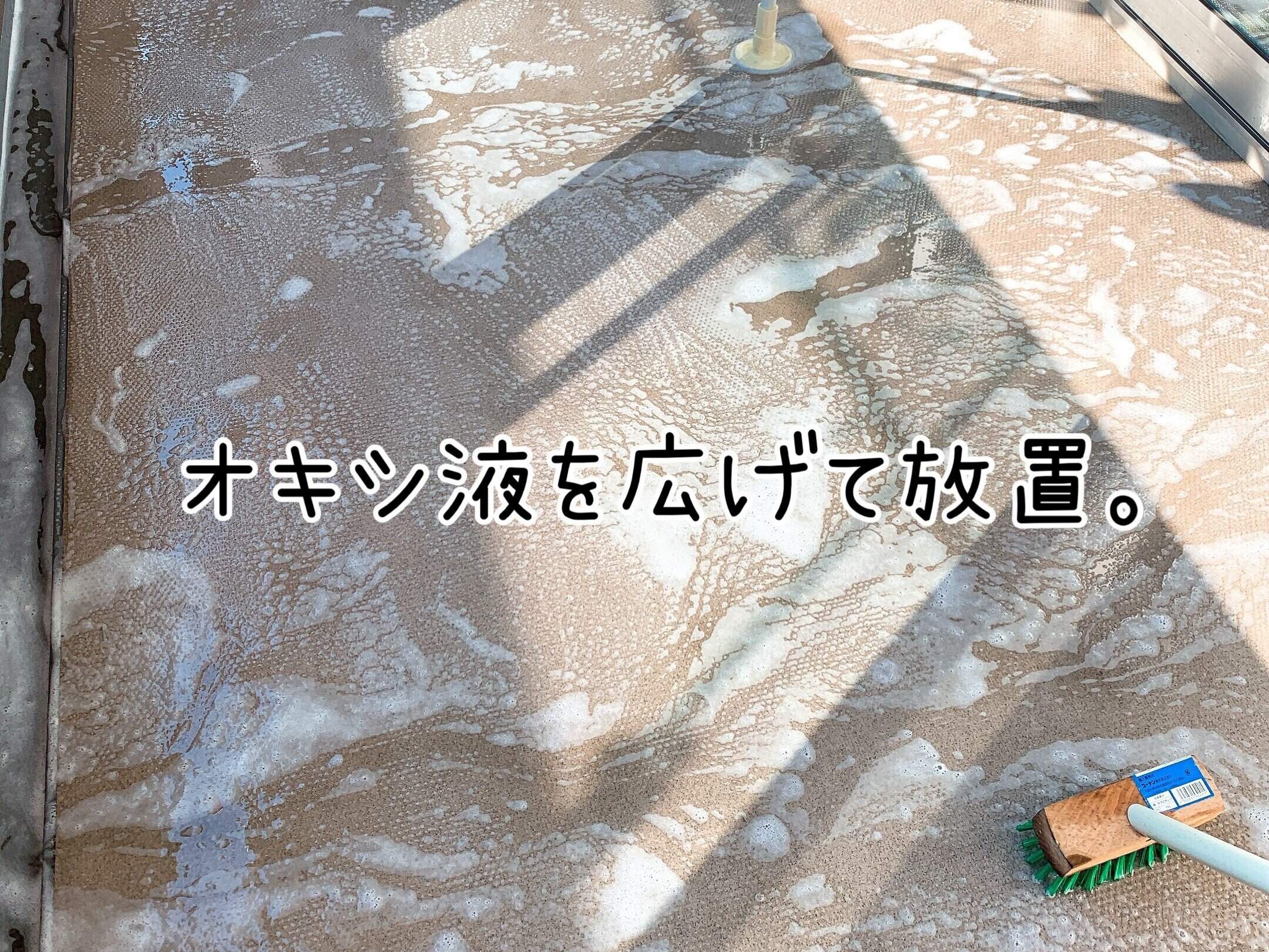 少しずつ流してブラシでバルコニー全体に広げていきます。この時はまだ磨きません。汚れに洗剤が反応するように、オキシ液を広げたら30分程度放置してください。