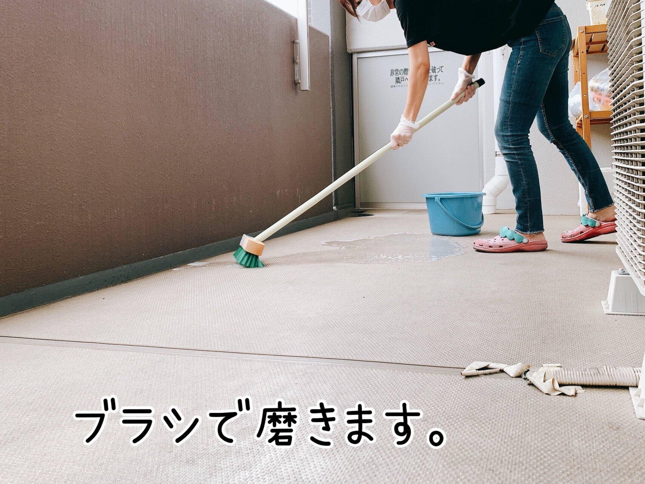 放置した後はデッキブラシで隈なく磨いていきます。デッキブラシも最近は安く買えますので、バルコニー掃除にはあると便利です!