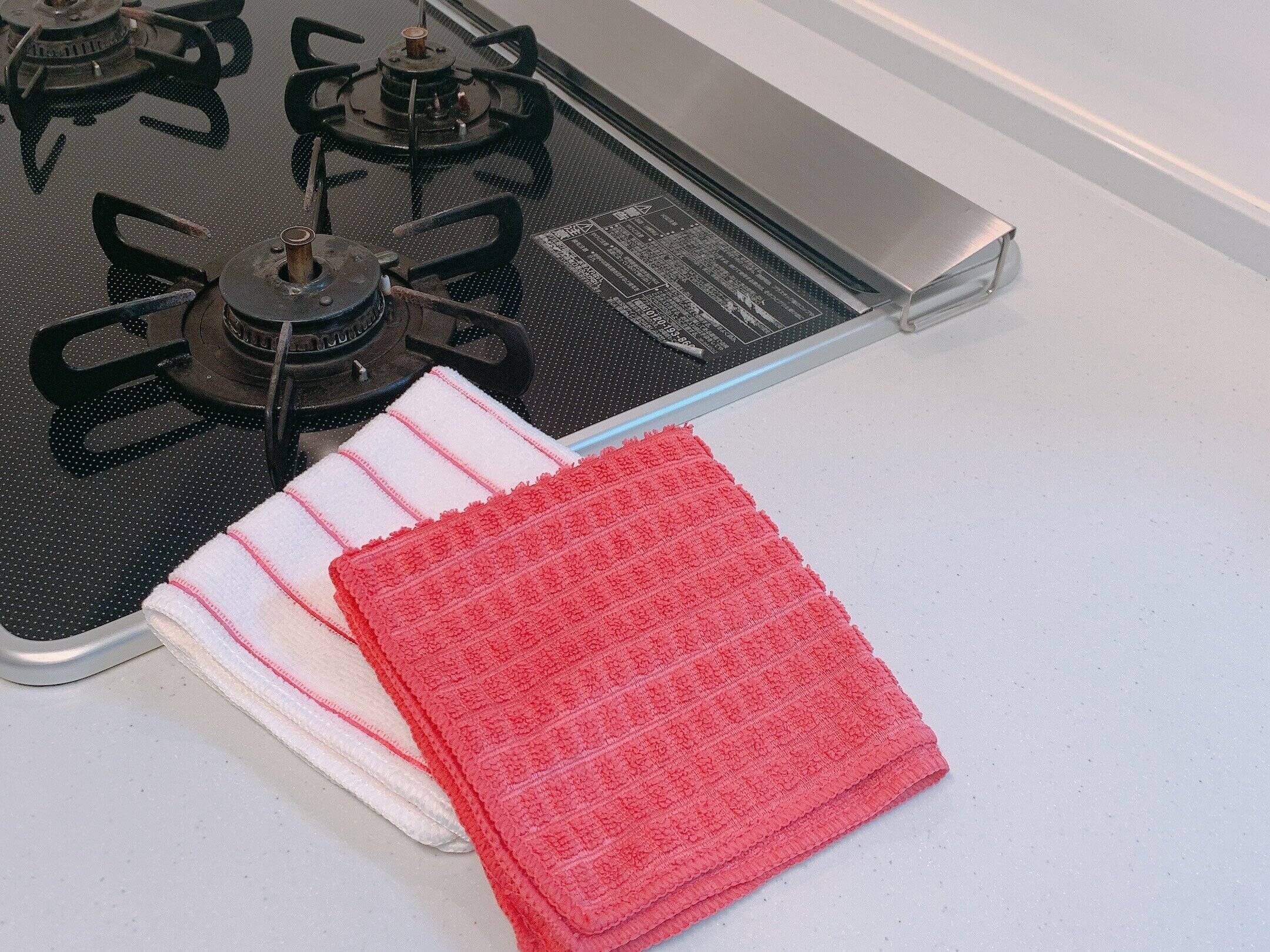 私のお気に入りは「マイクロファイバータオル」です。ナイロンやポリエステルからできている合成繊維。掃除におすすめの大きな理由としては吸水性と速乾性が抜群ということです。シンクまわりや洗面台まわりの水分を拭きとるのにとても役立ちます。また、速く乾いてくれるので、掃除後のタオルの嫌なニオイも発生しにくくなります。