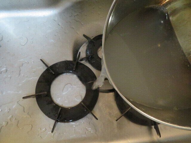 軍手をして五徳を全て取り外し、シンクに置いてゆで汁をザーッと。