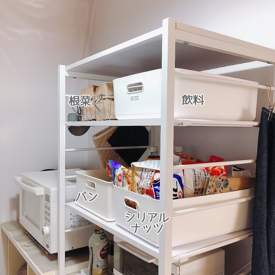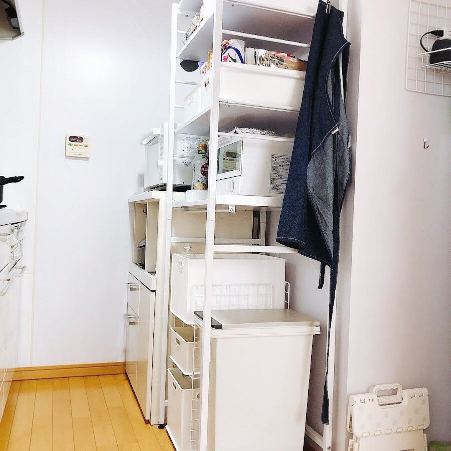 キッチンラックには食品、トースター、そして下をゴミ箱置き場にしています。