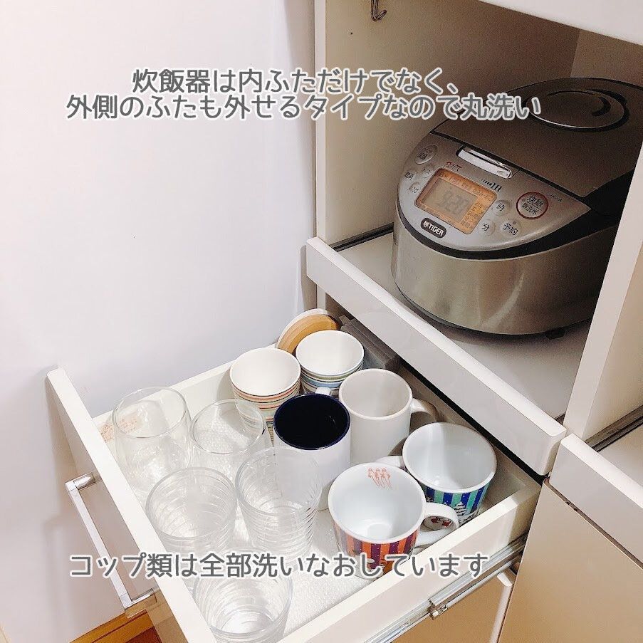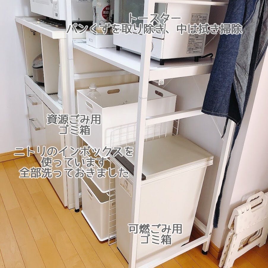 ラックはすべて拭いて、ゴミ箱も食品を入れているボックスも全部洗っています。