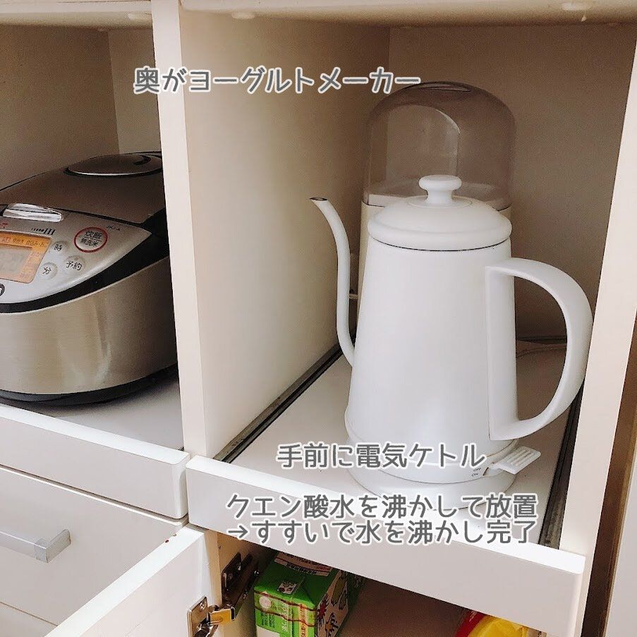 レンジ台にはオーブンレンジ、炊飯器、電気ケトル、ヨーグルトメーカーを置いています。
