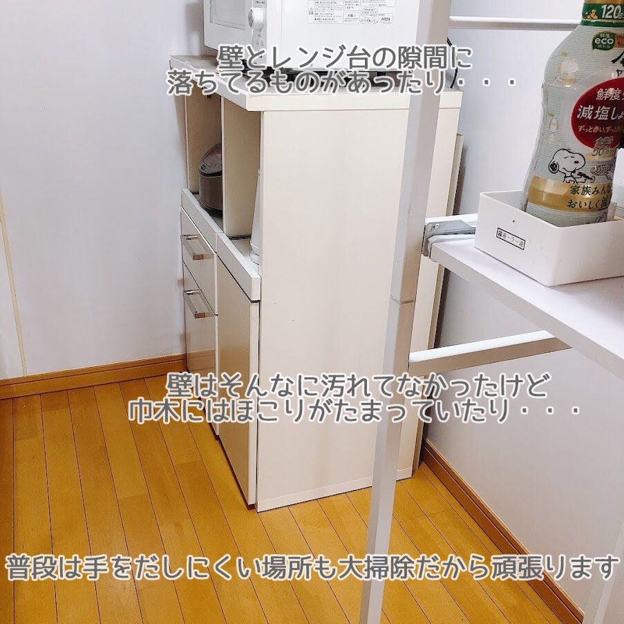 壁や床は別の日にやりますが、その時に家具を動かすのは大変なので、レンジ台もキッチンラックも動かしてやってしまいます。