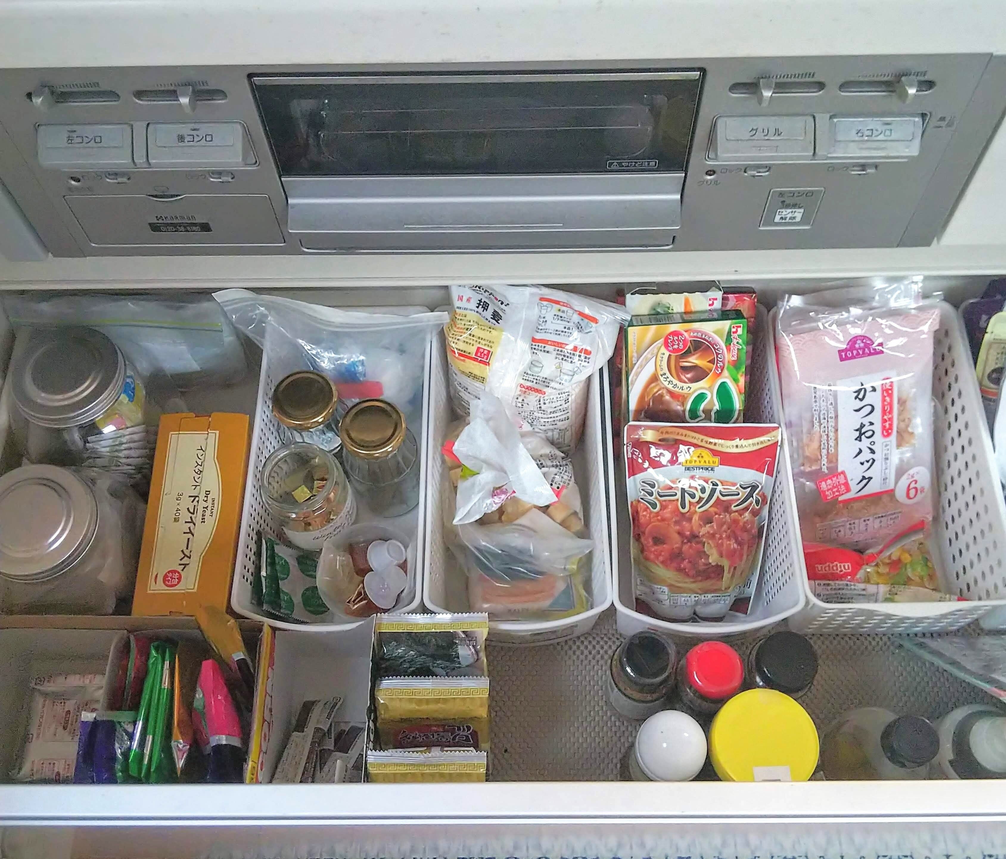 など、いいことづくめです。我が家ではコンロ下にストック食材を収納しています。インスタントスープやスティックコーヒー、調味料などいろいろ入っていますが、ここだけと決めているので、なくなるものがすぐわかります。