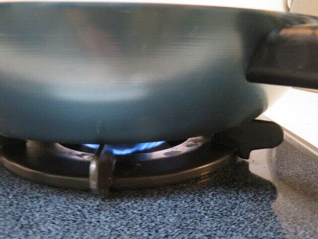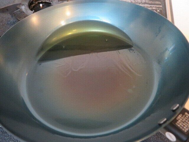 少し多めに油を入れてしっかりなじませ、前のフライパンで使っていた蓋をかぶせて数分間弱火で放置。