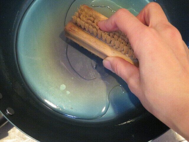 使い終わってすぐ、お湯で流してたわしでごしごしこするだけ。