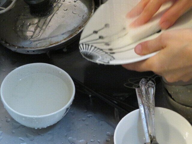 ある程度水につけていた方が洗いやすいご飯のお椀や鍋、小さな箸やスプーンは後回しにして面積の広いお皿をどんどん片づけていきましょう。