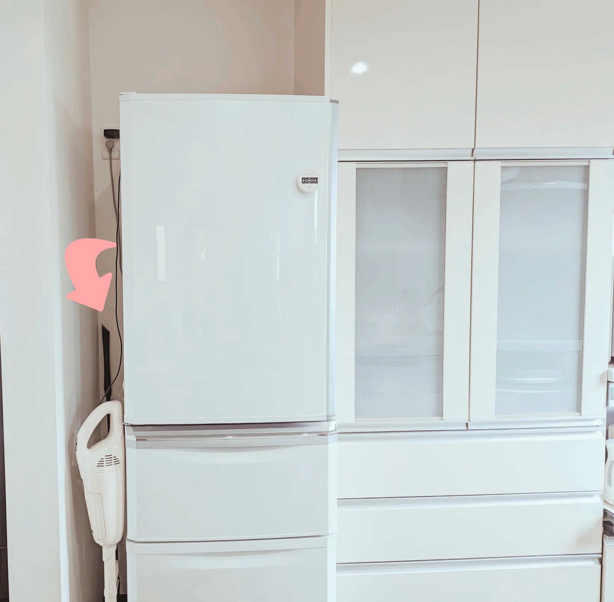 考えなくても身体が動くように、掃除グッズはキッチンにまとめて収納。コードレスクリーナーの定位置=冷蔵庫横にフローリングワイパーをスタンバイさせて、掃除機終わりにそのまま水拭きに取りかかれるように。