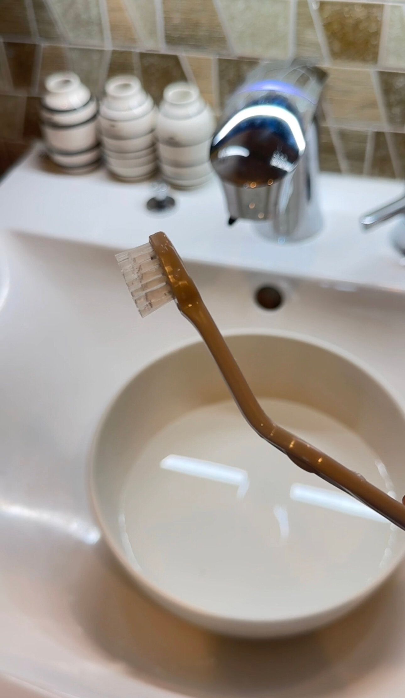 ②お湯70度くらいにつけながら、歯ブラシを曲げる