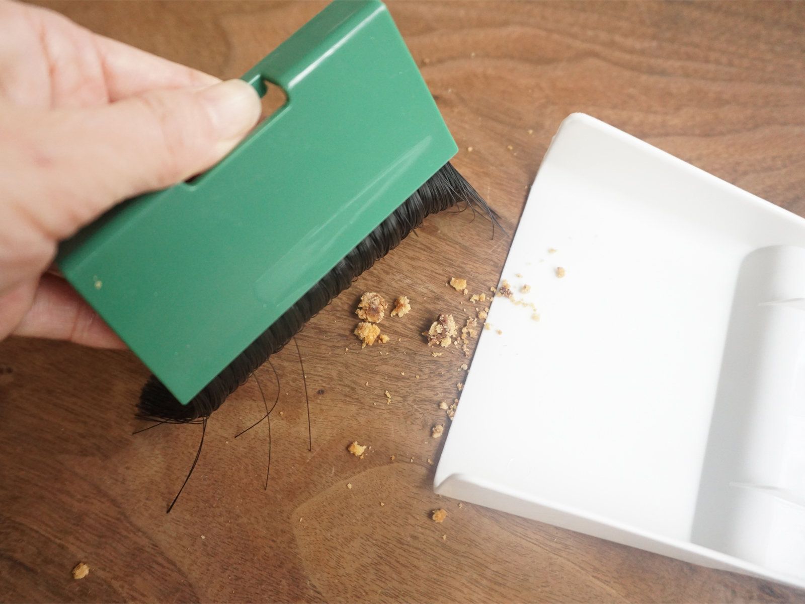 わが家では食卓とリビングテーブルの近くに配置されています。子どもたちが食事やおやつを食べたあとや、宿題をやったあとにはほぼ毎度登場し、テーブルの上のゴミをささっと回収します。食べこぼしや消しゴムかすなどはいきなりクロスなどで拭き取るよりも、掃いてしまった方が効率的。