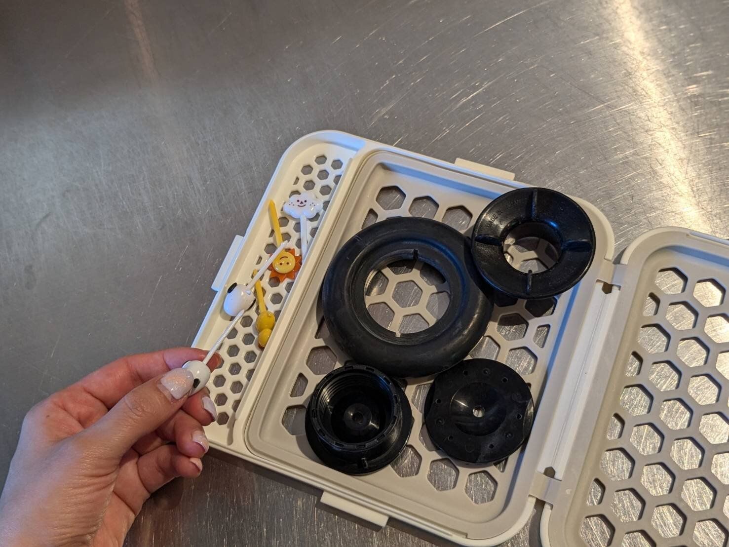 おかずカップや水筒のパーツなどの細かいアイテムはもちろん、もはや食洗機の使用は絶望的と思われていた「ピック」まで難なく収納することができますよ。