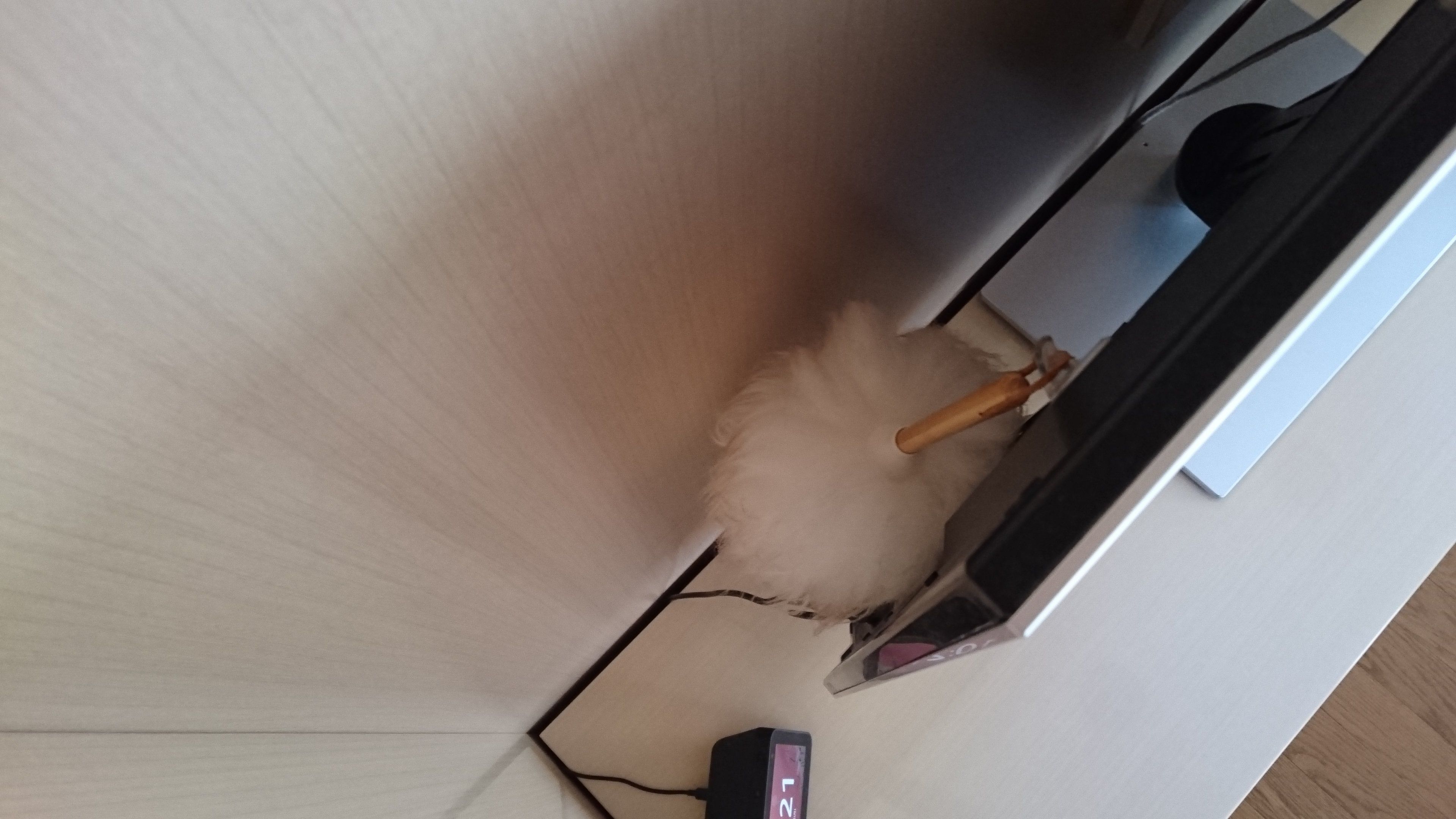 そこで、すぐお掃除できるようにTVの裏にフックを貼り付け、埃取り用のウールダスターを引っ掛けて収納するようにしました。
