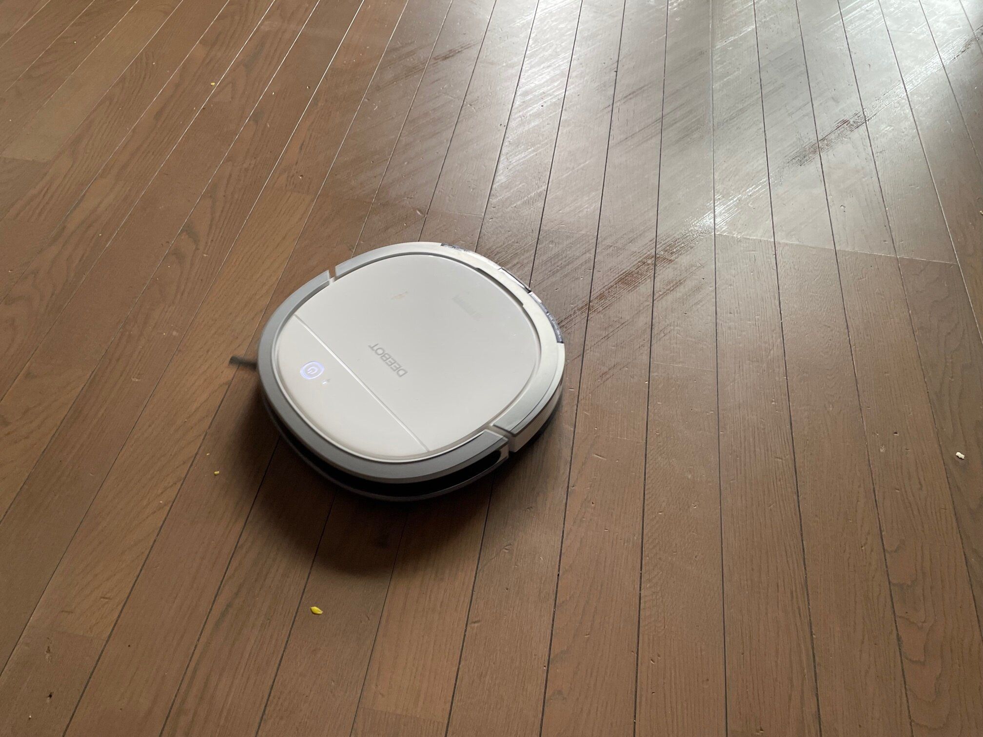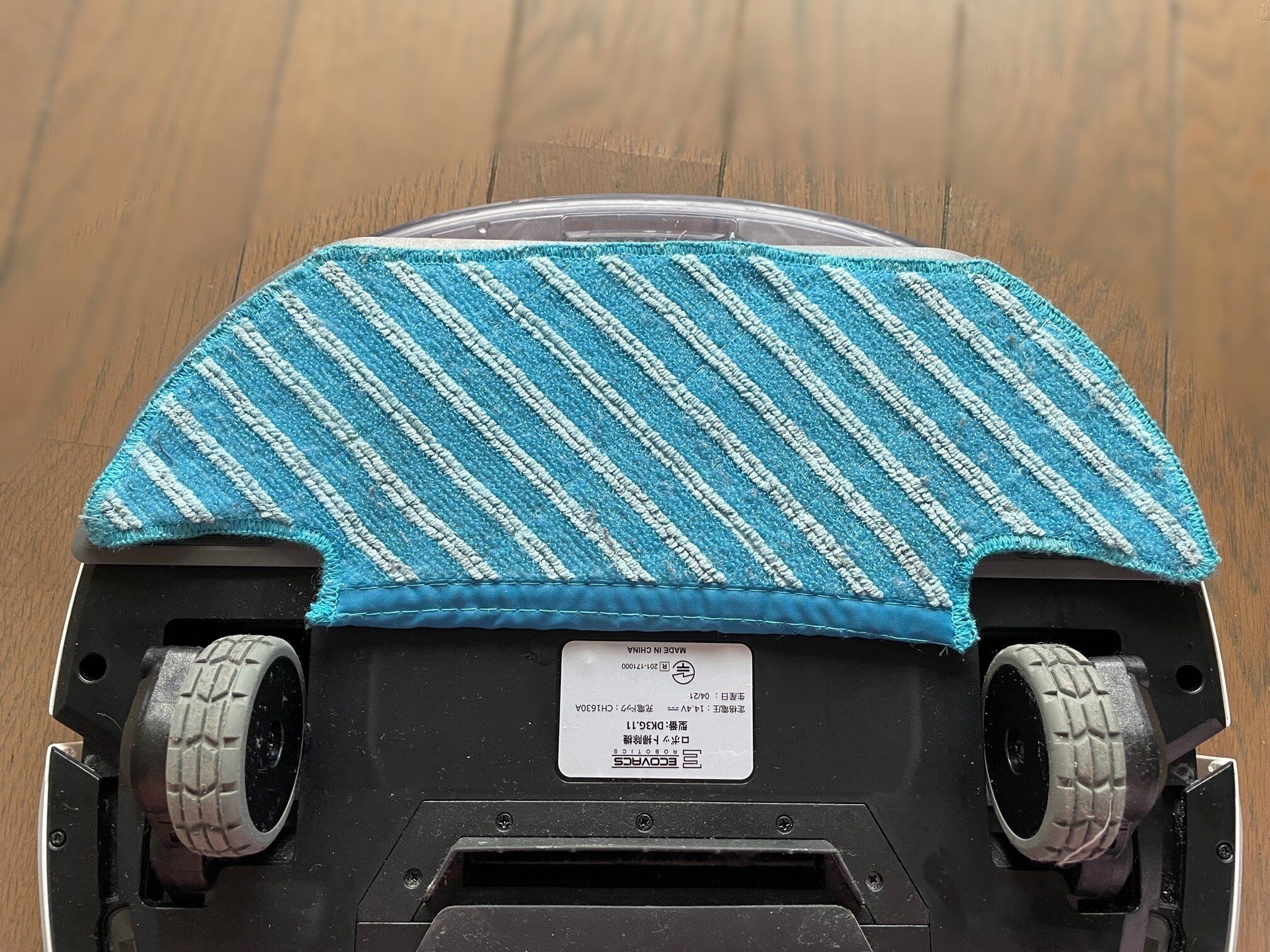 モップをセットしたら、本体のスイッチかスマホアプリでスイッチをONにすればすぐに掃除が始まります。前方部分でゴミを吸い、後方部分で水拭きをしながら進みます。なるほどこれなら一度にできますね。とても効率的です。
