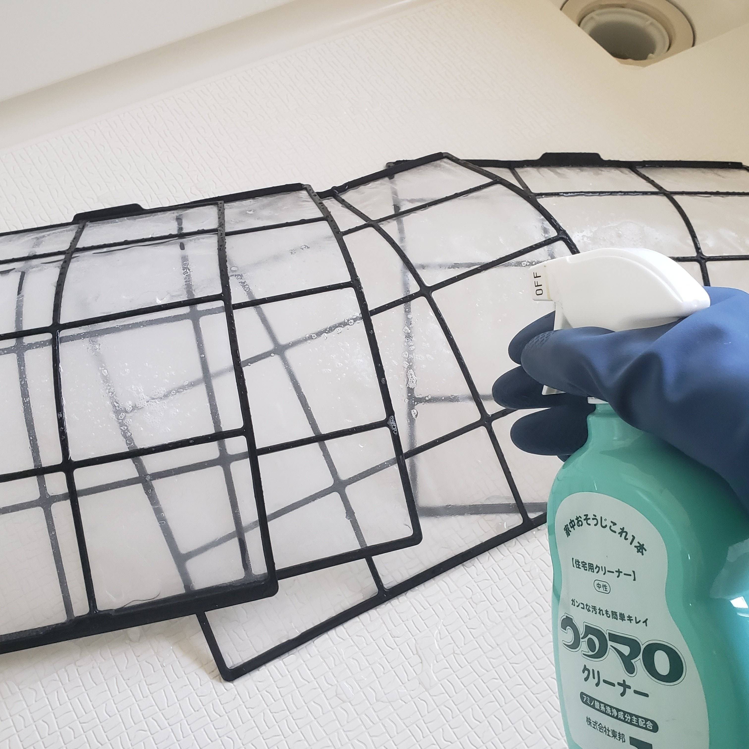 埃を取り除いたら、フィルターを軽く濡らしてウタマロクリーナーを2~3プッシュほど吹きかけます。