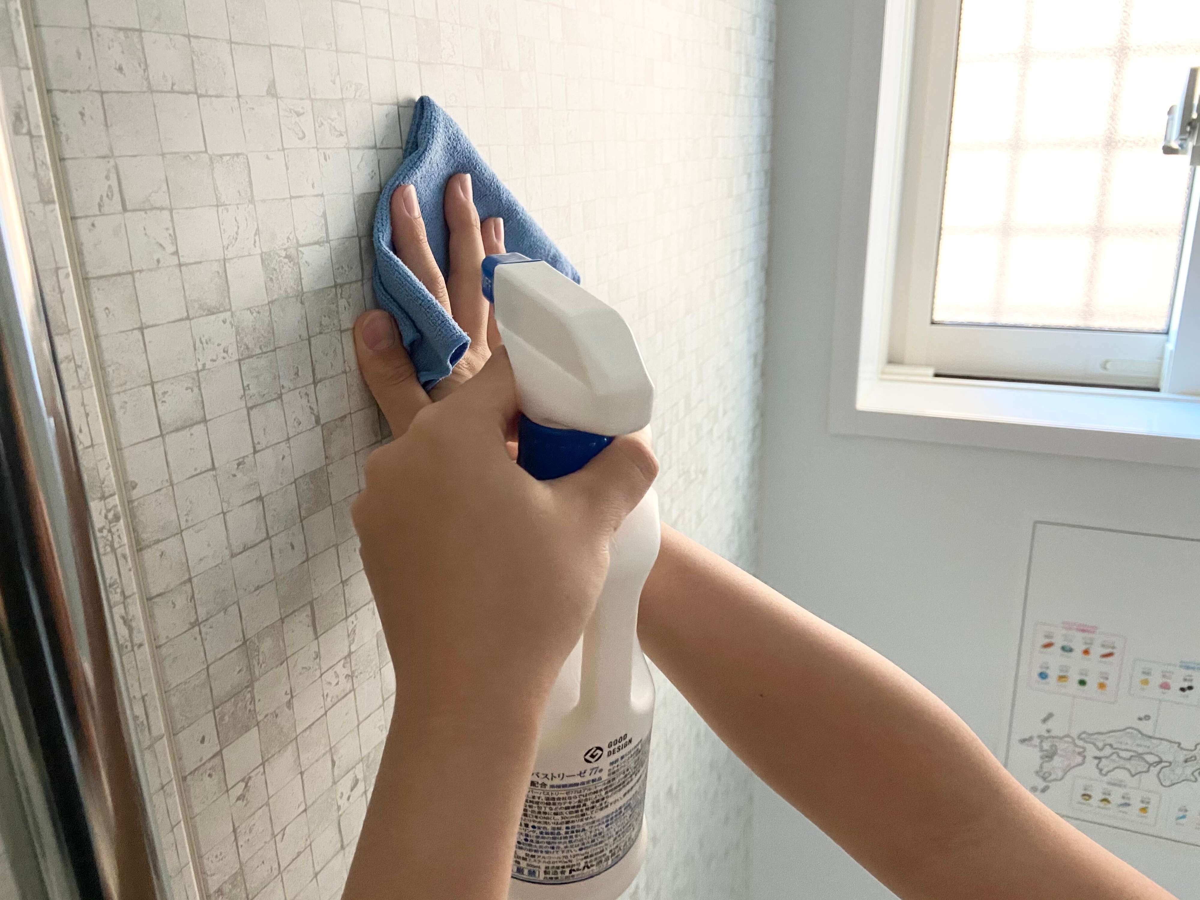 水垢取りだけでなく、防カビにも効果のあるパストリーゼ(アルコール成分77%のスプレー)。壁にはそのまま噴射して拭きあげるだけ、天井はクイックルワイパーを活用してパストリーゼをしっかりスプレーした厚手のペーパーまたはクロスで拭き上げれば完了です。