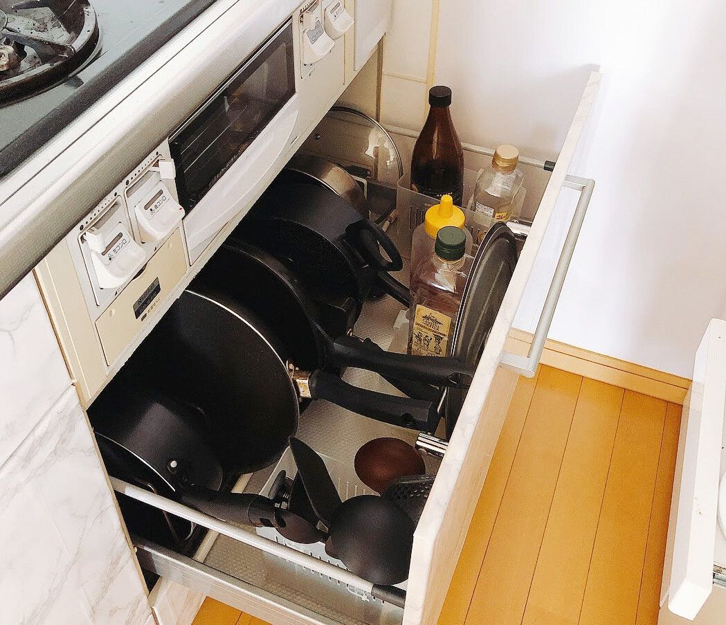 調理中のラクさを優先するなら、お玉やフライ返し、フライパンなどをかけて収納したり、調味料を出しておいたりするのも1つの方法。
