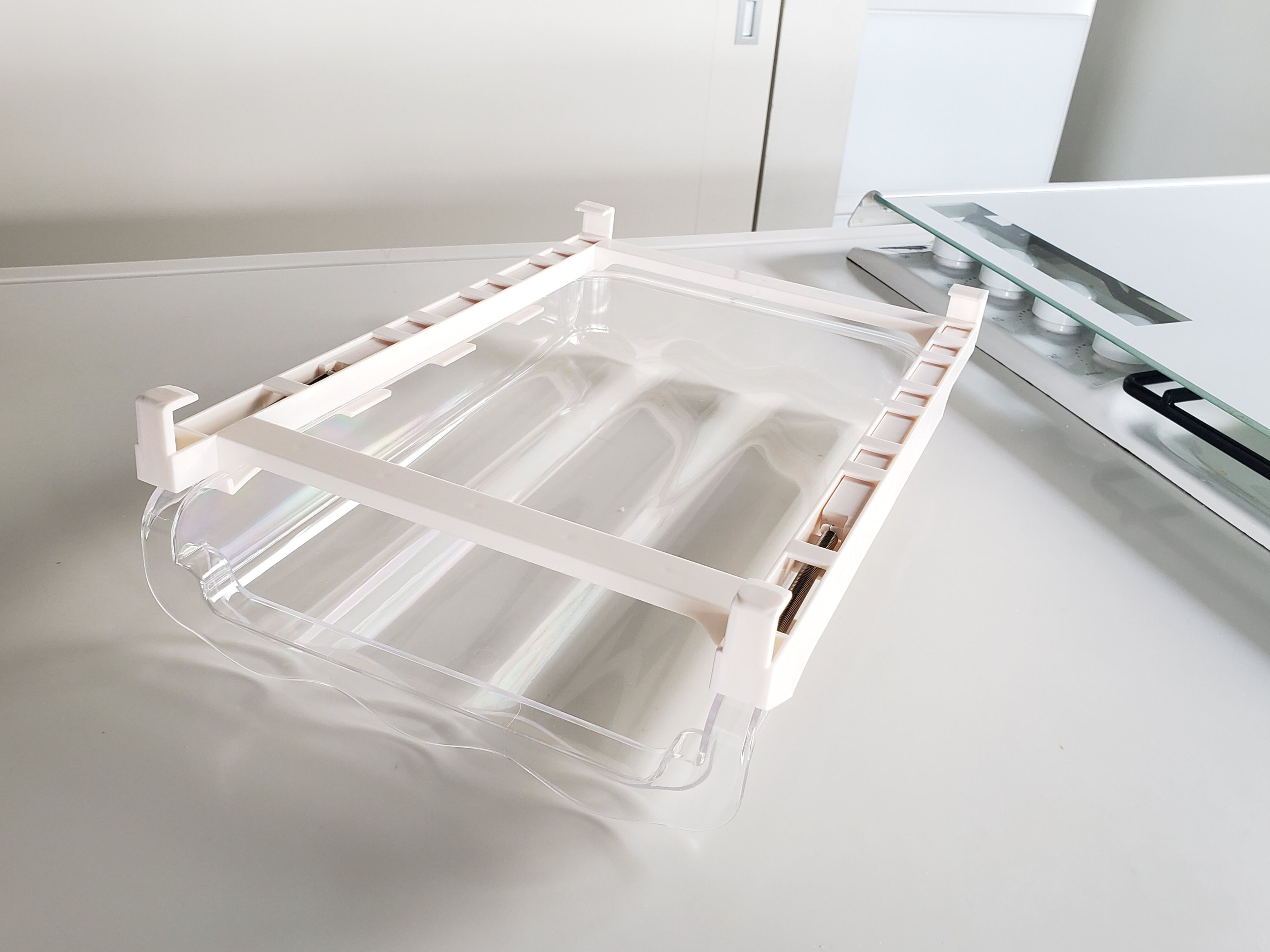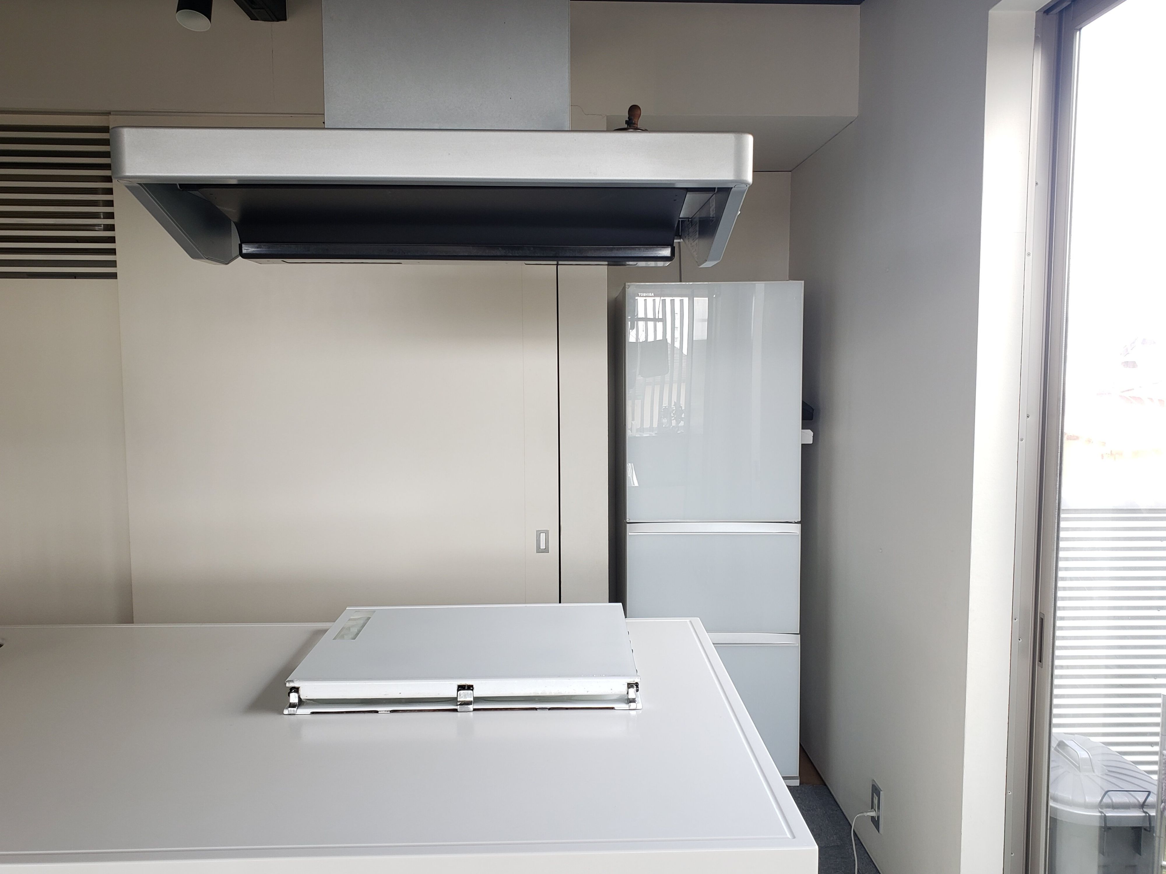 最初、棚板が半分にスライドできる所に設置しようとしたらやっぱり厳しそうでしたので、普通の棚板に設置するのがいいかと思います。
