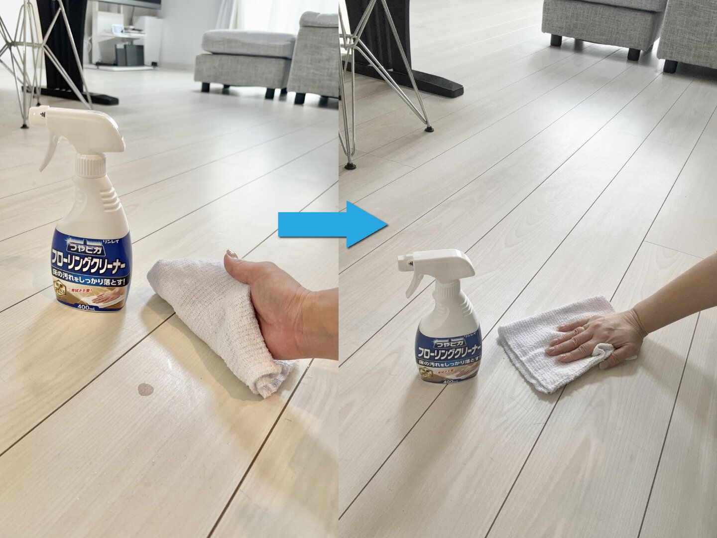 白い床なのでとにかく汚れが目立つのですが、「つやピカ フローリングクリーナー」はそんなにゴシゴシと拭かなくても汚れが落ちて、わたしみたいな掃除嫌いには使いやすいなと思いました! 二度拭きがいらないのもうれしいポイント!