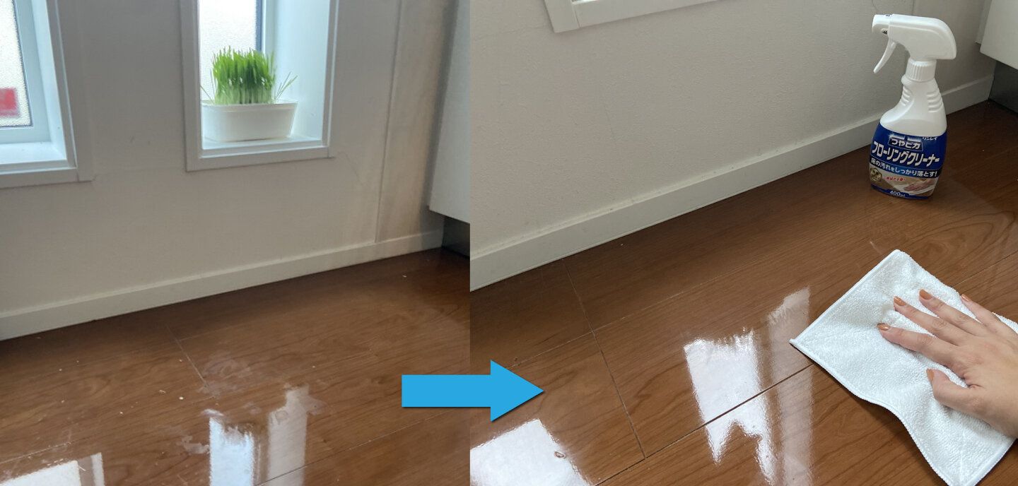 白い床のはずが段々とグレー?ベージュとくすんできていましたが、「つやピカ フローリングクリーナー」と「つやピカ フローリングコート」を合わせ使いした事で見違えるようにきれいな床になってこのまま持続させたいなと思いました!