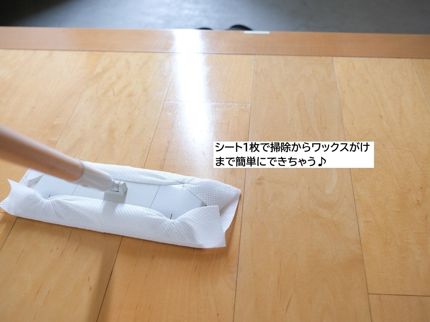 特長1)1枚で床の汚れを落とすだけでなく、ワックスがけまでできちゃうから、使ったあとはキレイな床に。