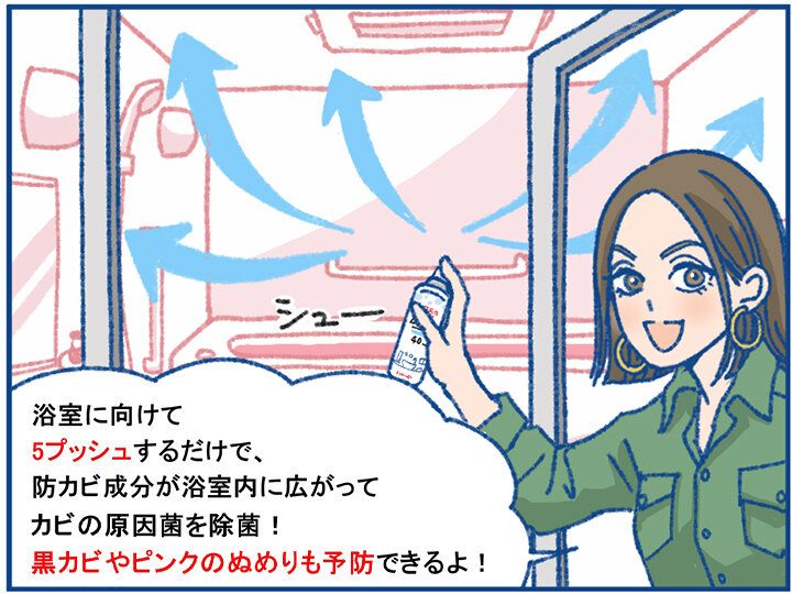 防カビ成分が浴室全体にいきわたるよう、浴室の入り口から方向を変えながら5プッシュするだけ! その後は10分以上浴室を閉め切り、10〜20分換気をすればOKです。換気後は、浴室内を洗い流す必要はなく、すぐに浴室を使えるのもうれしいポイント。