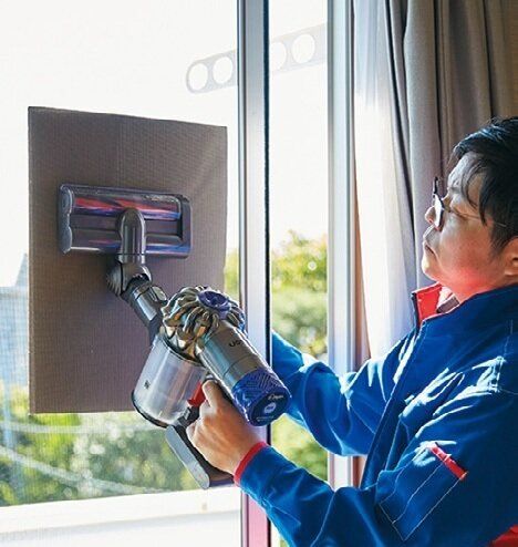 段ボールを網戸の外側に当て、内側からハンディクリーナーで吸うと汚れがよく取れる。外側に新聞紙をマスキングテープで貼る方法も。