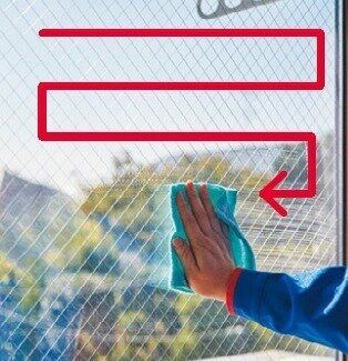 アルカリ電解水を古タオルにスプレーし、窓の上半分をコの字に拭く。窓に直接スプレーすると垂れ筋ができるので注意。