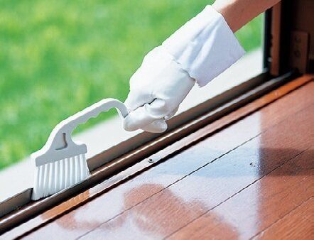 サッシ用のブラシや古歯ブラシで、サッシの隅や奥にたまった汚れをかき出す。固まった汚れは軽くたたいて砕く。