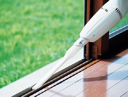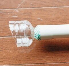 掃除機のすき間ノズルの先端に、500mlのペットボトルを斜めに切った物をテープで固定し、砂ぼこりや乾いた汚れを吸い取る。