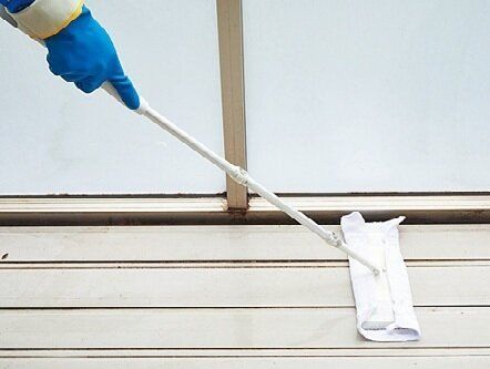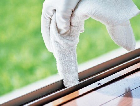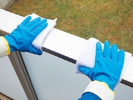 手すりや柵、物干し竿などを水拭き後、から拭きする。ぬらした古タオルを右手、乾いた古タオルを左手に持って拭くと時短に。
