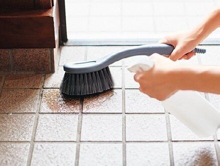 アルカリ電解水をたたきにスプレーして1~2分おき、洗車ブラシで汚れをこすり落とす。仕上げに古タオルでから拭きする。