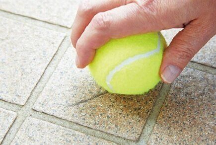 靴底のゴムが床面と接触してこびりついた「ヒールマーク」は、水を少しつけたテニスボールでこするとキレイに。