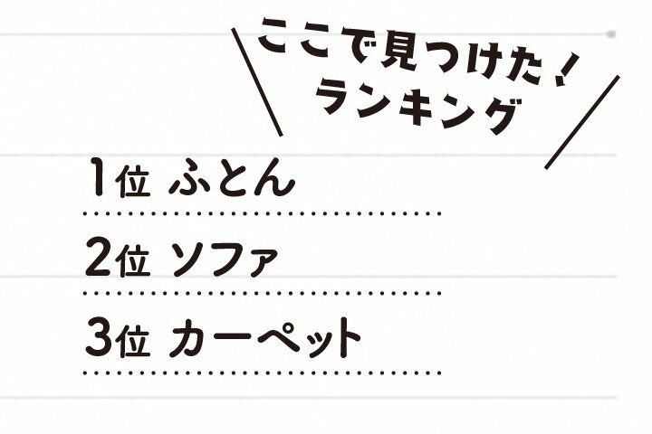 また、半数以上のおうちのふとんでダニが見つかり、次いで、ソファやカーペットなど、丸洗いできない物にダニがいることが判明!