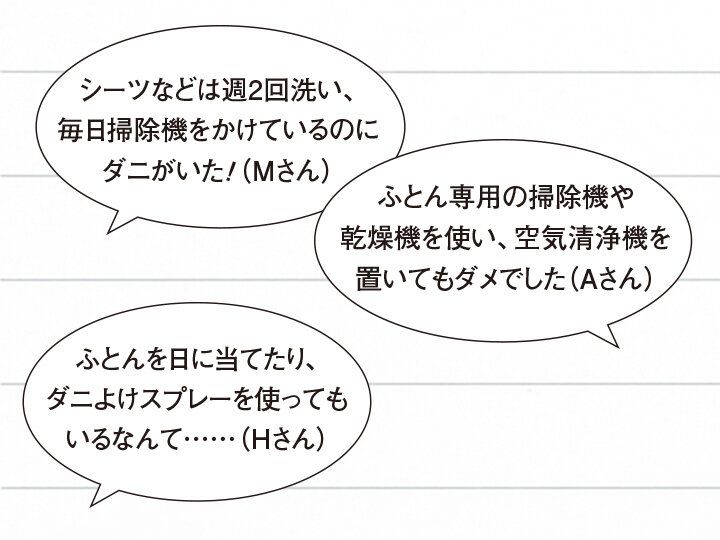 通常、ダニは目に見えません。いるかいないかわからなくてもやっぱり気になるということで、半数以上のおうちでダニ対策が実施されていました。それでも駆除しきれないというのが怖いですね……。