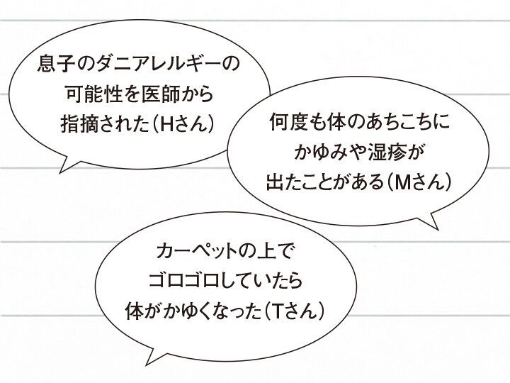 半数近くのモニターが、ご自身もしくはご家族がダニ被害にあったことがあると回答。皮膚がかゆくなったり、赤くなったというだけでなく、ダニアレルギーを疑って、お医者さんにかかったことがある人もいました。