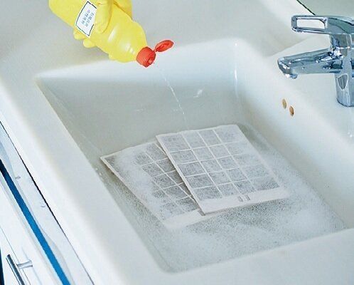 取扱説明書を確認してフィルターをはずし、栓をした洗面台やたらいなど大きめの容器に入れる。40℃くらいのお湯を入れて浸し、浴室用中性洗剤をピューッと3秒ほど回しかける。