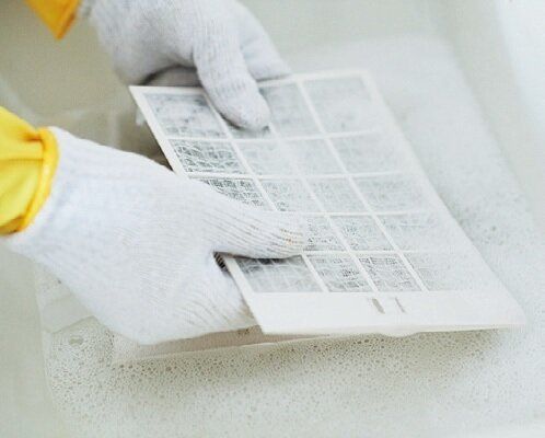 つけ置きして10分たったら、フィルターのゴミやほこりを軍手でやさしくなでるように取り除く。水ですすいで乾かせば完了。