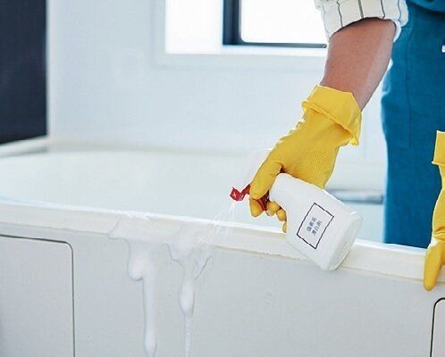 ほかの洗剤を完全に洗い流し、カビが生えている部分にカビ取り洗剤をスプレーする。浴槽と壁や床の間を埋めるシリコン部分やタイルの目地、ドアのパッキンなどはカビが生えやすいので確認を。