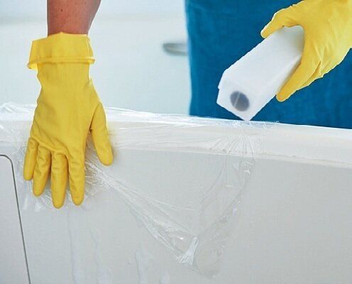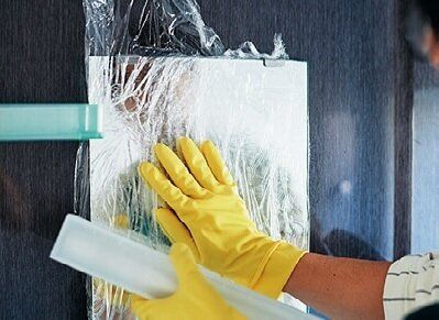カビ取り洗剤をスプレーしたら、液垂れしないようにキッチンラップを貼りつける。液垂れしやすい部分は、10cmくらいずつスプレー→ラップを貼るを繰り返すとよい。15分放置したらラップをはがし、しっかり水で流す。