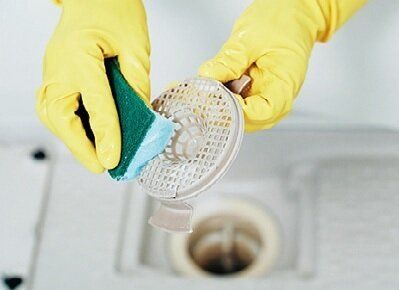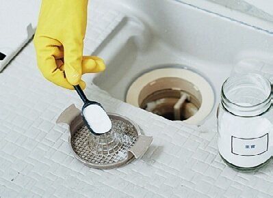 排水口を開けてパーツを取りはずし、排水口の中とパーツに重曹をたっぷりとふりかける。汚れが見えなくなるくらいの多めの量でOK。