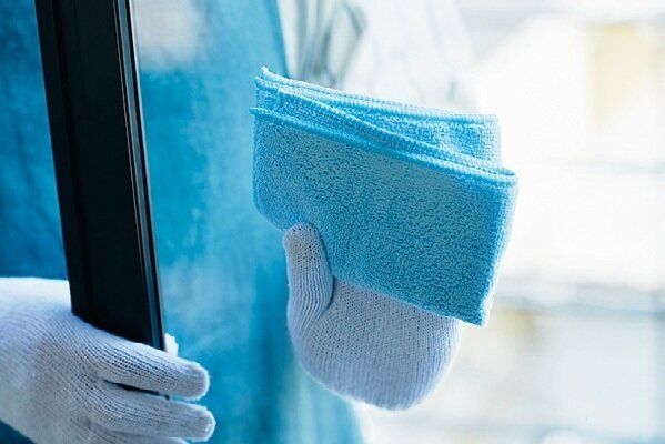 窓にアルカリ電解水を直接スプレーし、マイクロファイバークロスで拭く。