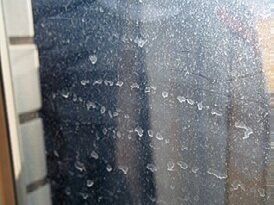 2年ほど放置していた窓の汚れ。雨の跡や砂ぼこりでこんなに汚れていたなんて……。でも、アルカリ電解水のパワーでみるみるキレイに。あっという間に透明感が復活。