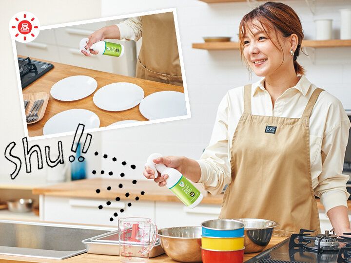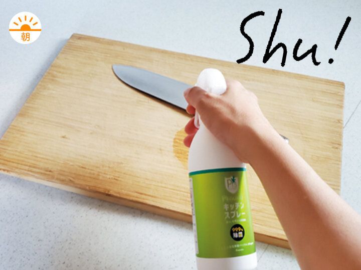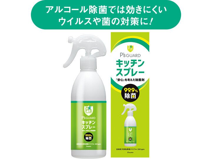 アルコールが効きにくいウイルスもあるので、「P’s GUARDキッチンスプレー」で時短。
